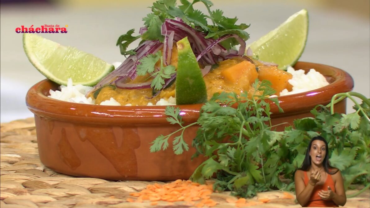 Curry de lentejas y buñuelos de espinaca