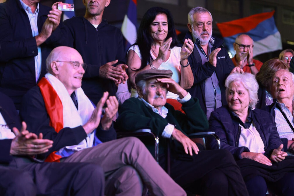 Acompañado por su esposa, la exvicepresidenta Lucía Topolansky, el nonagenario político considerado un referente de la izquierda latinoamericana y reconocido por su sencillez y su pensamiento humanista lo miró desde su silla de ruedas en primera fila mientras sostenía su bastón.
