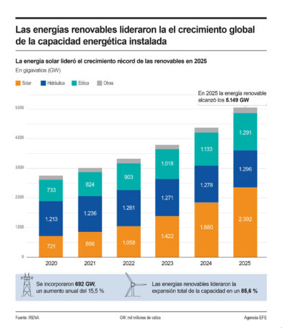 Las energías renovables lideraron en un 85,6 % el crecimiento global de la capacidad energética instalada en 2025, alcanzando los 5.149 gigavatios (GW), gracias a un aumento de 692 GW en el que la energía solar y la eólica se llevaron el protagonismo, según la Agencia Internacional de las Energías Renovables (Irena).