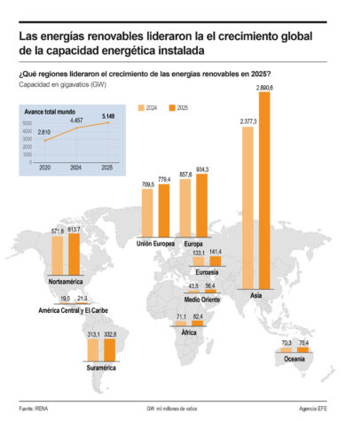 Las energías renovables encabezaron el crecimiento de la capacidad energética instalada a nivel mundial en 2025, al representar el 85,6% de la expansión global, según datos de la Agencia Internacional de Energías Renovables difundidos por EFE.