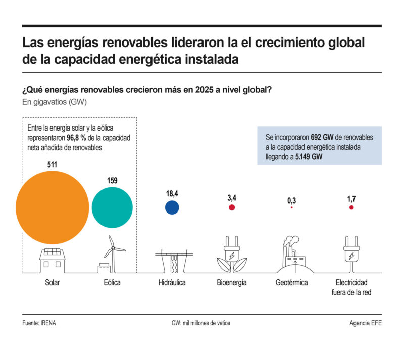 Las energías renovables lideraron en un 85,6 % el crecimiento global de la capacidad energética instalada en 2025, alcanzando los 5.149 gigavatios (GW), gracias a un aumento de 692 GW en el que la energía solar y la eólica se llevaron el protagonismo, según la Agencia Internacional de las Energías Renovables (Irena).