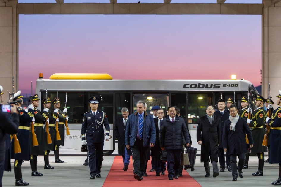 El mandatario fue recibido por el ministro de Agricultura y Asuntos Rurales de China, Han Jun; el embajador de la República Popular China en Uruguay, Huang Yazhong, y el embajador de Uruguay en China, Aníbal Cabral. La comitiva oficial, integrada por autoridades de gobierno y representantes del sector empresarial, arribó a Beijing este domingo 1.